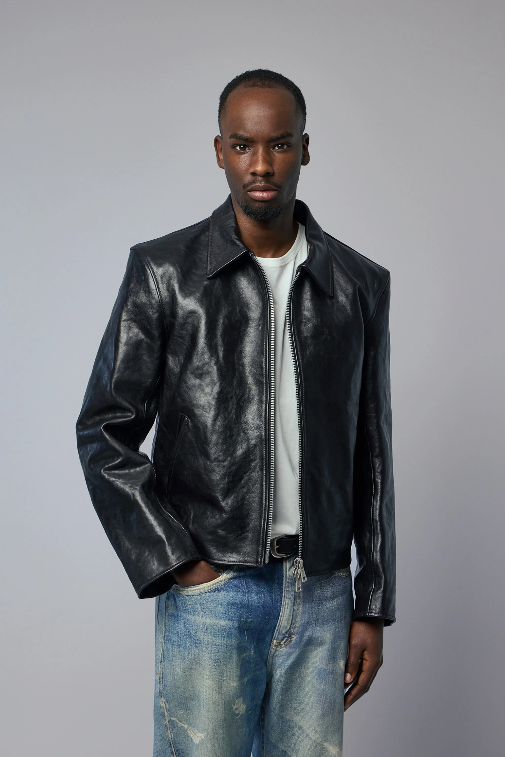SKU: 154711 Leather jacket featuring a classic design with a sleek appearance. The jacket has a front zip closure and two side pockets, ideal for a stylish and practical look. - Black leather material - Front zip closure - Two side pockets - Boxy silhouette - Collared neck design Materials: 100% Leather Color: Dyed Black True to Size The model is 1.89m (6.2ft) and wears a size 50. The item fits as expected according to standard sizing. Order your usual size.