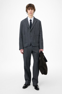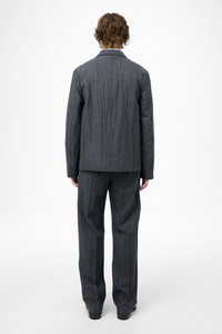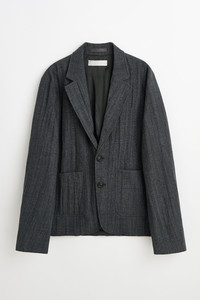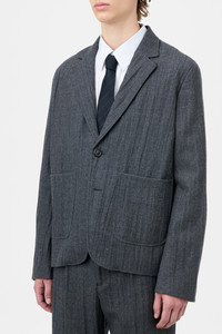 Details · Italian fabric · 88% Virgin Wool 12% Polyamide · Plisse treatment · Fully lined · Horn buttons · Notched lapel · Patch pockets · Boxy, short fit · M4250TS Description Our Temp Blazer in Stone Grey Plisse Wool. Produced in Italian virgin wool and polyamide fabric, the men's Temp Blazer has a boxy, short fit and features a plisse treatment, full lining, horn buttons, notched lapel and patch pockets. This garment is crafted from a carefully selected fabric featuring a plisse treatment, chosen for its unique texture and character. This specialized technique creates a permanent crinkled and pleated effect, giving the material a distinctive three-dimensional quality and dynamic visual appeal.