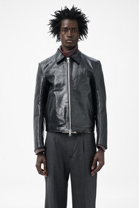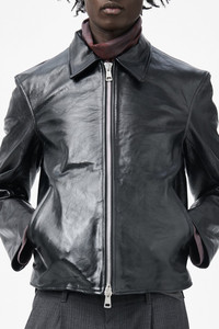 Details · Italian cow leather · Vegetable tanned · Fully lined · Lampo two way zip · Jet front pockets · Minimalist, boxy fit · M4239MTD Description Our Mini Jacket in Top Dyed Black Leather. Produced in a vegetable tanned Italian leather, the minimalist Mini Jacket has a boxy fit and features a Lampo two way zip, a cotton and viscose lining and jet front pockets.