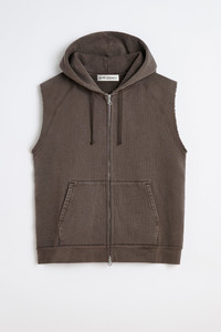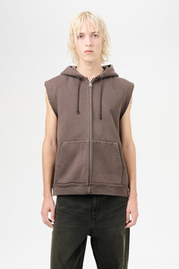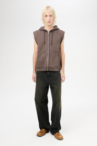 Details · Portuguese heavyweight jersey · 100% Organic Cotton · Piece dyed · Sun faded wash · Drawstring hood · Cut raw edge raglan sleeves · Lampo two way zip · Kangaroo pocket · Ribbed hem · Regular, straight fit · M2256MF Description Our Motor Hood Vest in French Sun Fade Hefty Fleece. Produced in a heavy weight Portuguese organic cotton jersey, with a sun faded wash, the mens Motor Hood Vest has a regular, straight fit and features a drawstring hood, a two way lampo zip, cut raw edge raglan sleeves, a kangaroo front pocket and a ribbed hem. This garment is manufactured using carefully sourced material with a unique treatment process that will give each garment an individual shade and appearance. This technique could result in some color bleed onto lighter garments or surfaces. The garment shall be shaped by its wearer and naturally distress over time to finish the design process.