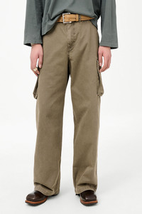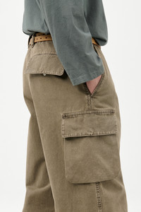 Details · Japanese fabric · 100% Cotton · Garment treated · Cargo side pockets · Darted knees · YKK zip fly · Steel buttons · Brass snaps · Single back pocket · Relaxed, straight cut · M4254MD Description Our Mount Cargo in Ditch Wash Out Twill. Produced in a premium Japanese cotton fabric with a garment treatment, these cargo pants feature functional side cargo pockets, darted knees for enhanced movement, and a YKK zip fly. Details include durable steel buttons, brass snaps for secure closure, and a single back pocket. This garment is manufactured using carefully sourced material with a unique treatment process that will give each garment an individual shade and appearance. This technique could result in some color bleed onto lighter garments or surfaces. The garment shall be shaped by its wearer and naturally distress over time to finish the design process.