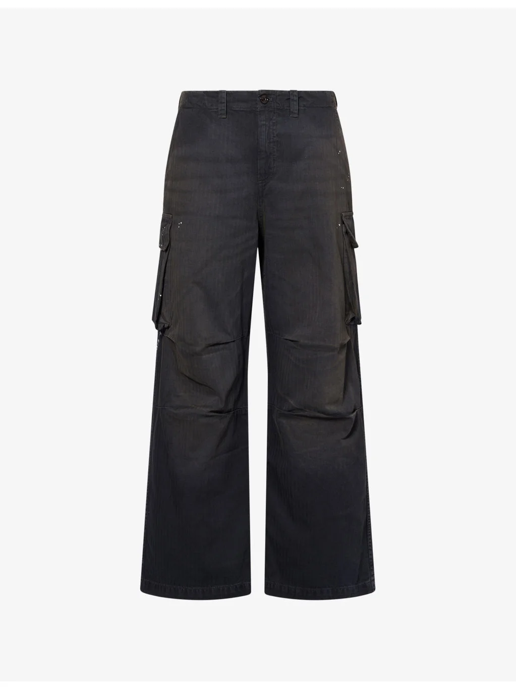 PRODUCT DETAILS - Our Legacy cotton cargo trousers - 100% cotton - Button and zip-fly fastening - Wide leg, cargo style, belt loops, patch pockets, paint splashes, dark wash - Machine wash mild - Size 32: rise 12.5in / 32cm, inside leg 31in / 78.7cm, leg opening 22in / 55.8cm - Model is 6ft 2in/1.88m and wears a size UK 32 - Midweight, non-stretch Ref: R04561284
