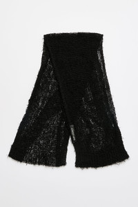Details · Italian yarn · 60% Linen 26% Nylon 14% Cotton · Ragged open knit net structure · Textured surface with a fringed fuzzy character · 1x1 single layer ribs · Measures 180 x 20 CM · A2268NB Description Our Net Scarf in Black Ragged Open Linen. Produced in Italian yarn blending linen, nylon and merino wool, the Net Scarf has an airy open-knit structure with a ragged, slightly fuzzy surface and features single-layer 1x1 ribbed ends. The scarf measures 180 x 20 cm. This garment is manufactured using a carefully sourced yarn. The natural characteristics of the yarn, combined with the construction of the knit allows the garment to expand when worn. The garment shall be shaped by its wearer and naturally distress over time to finish the design process. To help keep the integrity of the garment please store the garment folded.