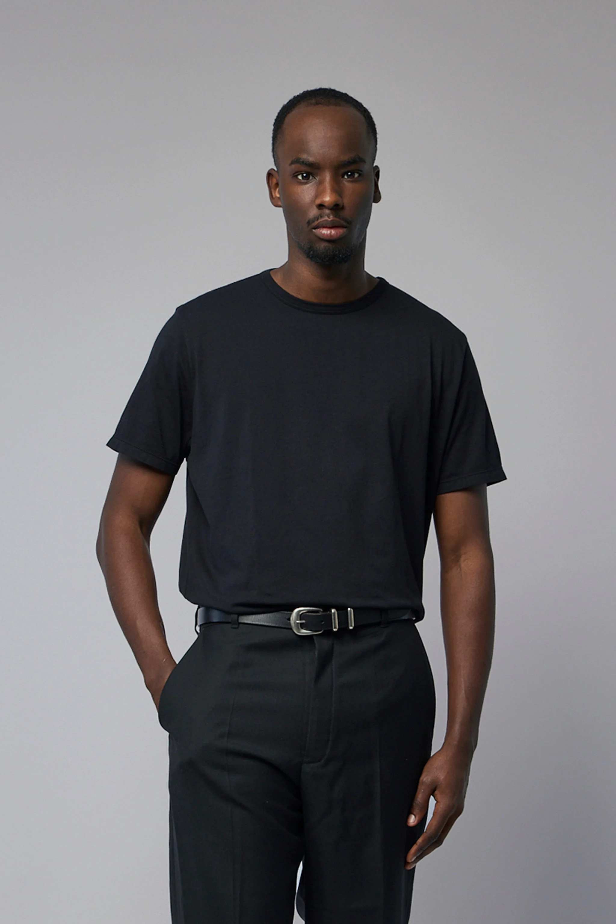 SKU: 154709 T-shirt in a solid, deep black shade, with a simple and classic round neckline and short sleeves, offering a timeless casual look. - Solid deep black color - Round neckline - Short sleeves - Straight hem - Relaxed fit Materials: 100% Cotton Color: Black True to Size The model is 1.89m (6.2ft) and wears a size 50. The item fits as expected according to standard sizing. Order your usual size.