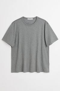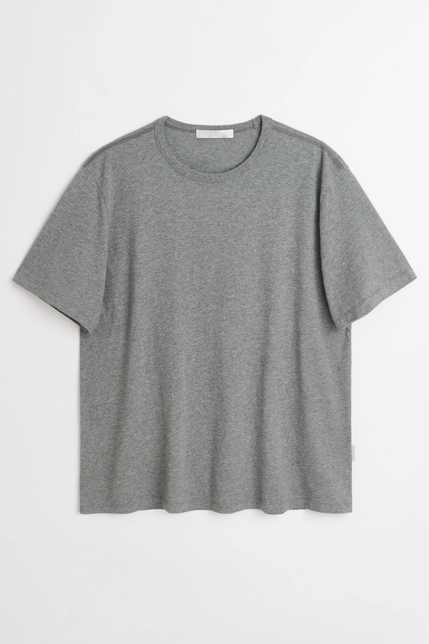 Details · Portuguese jersey · 100% Cotton · Fine rib collar · Pigment dyed · Overlocked shoulder seams · Straight hem · Wide boxy fit · M4226NGM Description Our New Box T-Shirt in Grey Melange Clean Jersey. Produced in a fine Portuguese cotton jersey the New Box T-Shirt features a fine rib collar, a straight hem and overlocked shoulder seams.