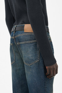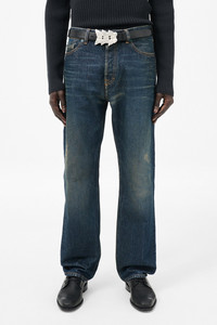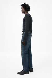 Details · Turkish denim · 100% Cotton · Distressed by hand · Each pair has unique fade · Five pockets · Button fly · Metal rivets · Our Legacy embossed patch · Regular, straight leg · Indigo dyed · M4255FS Description Our First Cut in Sand Tint Turkish Denim. Produced in Turkish cotton denim, the men's First Cut has a regular, straight leg fit and features a button fly, metal rivets, five pockets, and an Our Legacy embossed patch. The open-end denim has been treated and washed to capture the essence of traversing the desert in raw denim. The fabric reflects a sun-faded, weathered aesthetic, with worn textures and muted tones reminiscent of prolonged exposure to harsh, arid environments. The fade and distressing have been meticulously crafted by hand, employing artisanal techniques to achieve a natural, uneven pressure and movement that cannot be replicated by machines. This garment is manufactured using carefully sourced material with a unique treatment process that will give each garment an individual shade and appearance. This technique could result in some color bleed onto lighter garments or surfaces. The garment shall be shaped by its wearer and naturally distress over time to finish the design process.