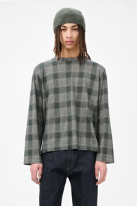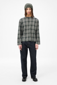 Details · Portuguese fabric · 100% Cotton · Printed check pattern · Oversized boxy fit · Fine ribbed collar · Vented side seams · Dropped tail · M4256BO Description Our Box Longsleeve in Oakland Check Legacy Jersey. Produced in a Portuguese cotton fabric with a checkered pattern, the men's Box Longsleeve has an oversized boxy fit and features a fine ribbed collar, vented side seams and a dropped tail. This garment is manufactured using carefully sourced material with a unique treatment process that will give each garment an individual shade and appearance. This technique could result in some color bleed onto lighter garments or surfaces. The garment shall be shaped by its wearer and naturally distress over time to finish the design process.