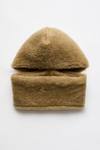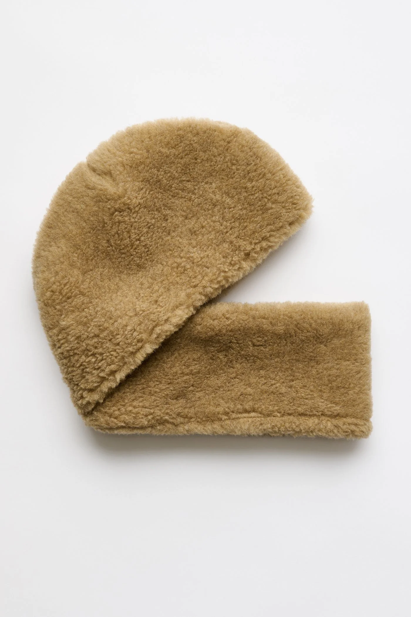 Details · Spanish fabric · 74% Wool 18% Acrylic 8% Polyester · Faux shearling · Fitted hat with attached neck snood · Neck snood can be pulled up to cover face · Snug around head, looser around neck · A4258WD Description Our Snood in Dusty Natural Curly Wool. Produced in Spanish faux shearling fabric with a wool, acrylic, and polyester composition, the Snood features a fitted hat design with an attached neck snood that can be pulled up to partially cover the face. The design fits snug around the head with a looser fit around the neck. This garment is manufactured from carefully sourced wool, which may felt over time due to friction, moisture, or heat. To preserve its appearance, handle with care and avoid excessive rubbing or exposure to heat and moisture. The wool will soften and evolve with wear, adding to its unique character.