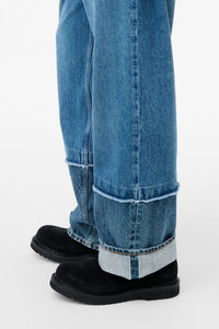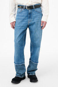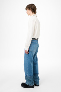 Details · Italian denim · 100% Cotton · Indigo dyed · Selvedge bottom leg · Relaxed fit · Wide straight leg · YKK zip fly · Metal rivets · OUR LEGACY embossed patch · Five pockets · Reinforced back pockets · M4255TS Description Our Third Cut in Shelly Wash. Produced in Italian denim, the men's Third Cut has a relaxed fit with wide straight legs and features a selvedge bottom leg, YKK zip fly, metal rivets, five pockets with reinforced back pockets, and an OUR LEGACY embossed patch. This denim is a fusion of two distinct fabrics combined into a single, cohesive design. Raw stitching details showcase the assembled aesthetic and the bottom part of the leg features selvedge fabric. This garment is manufactured using carefully sourced material with a unique treatment process that will give each garment an individual shade and appearance. This technique could result in some color bleed onto lighter garments or surfaces. The garment shall be shaped by its wearer and naturally distress over time to finish the design process.