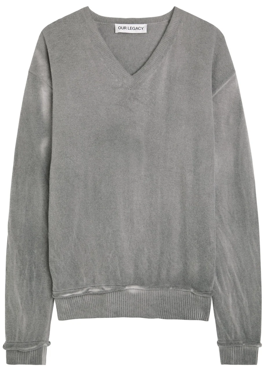 Info & Care Our Legacy merino wool jumper V-neck,;dropped shoulders, ribbed trims Slips on 100% merino wool Hand wash Size & Fit Length shoulder to hem: 28 inches/ 71cm Midweight Relaxed fit Model is 6'2"/ 188cm, chest size 38 inches and wears a size mediuIT48m