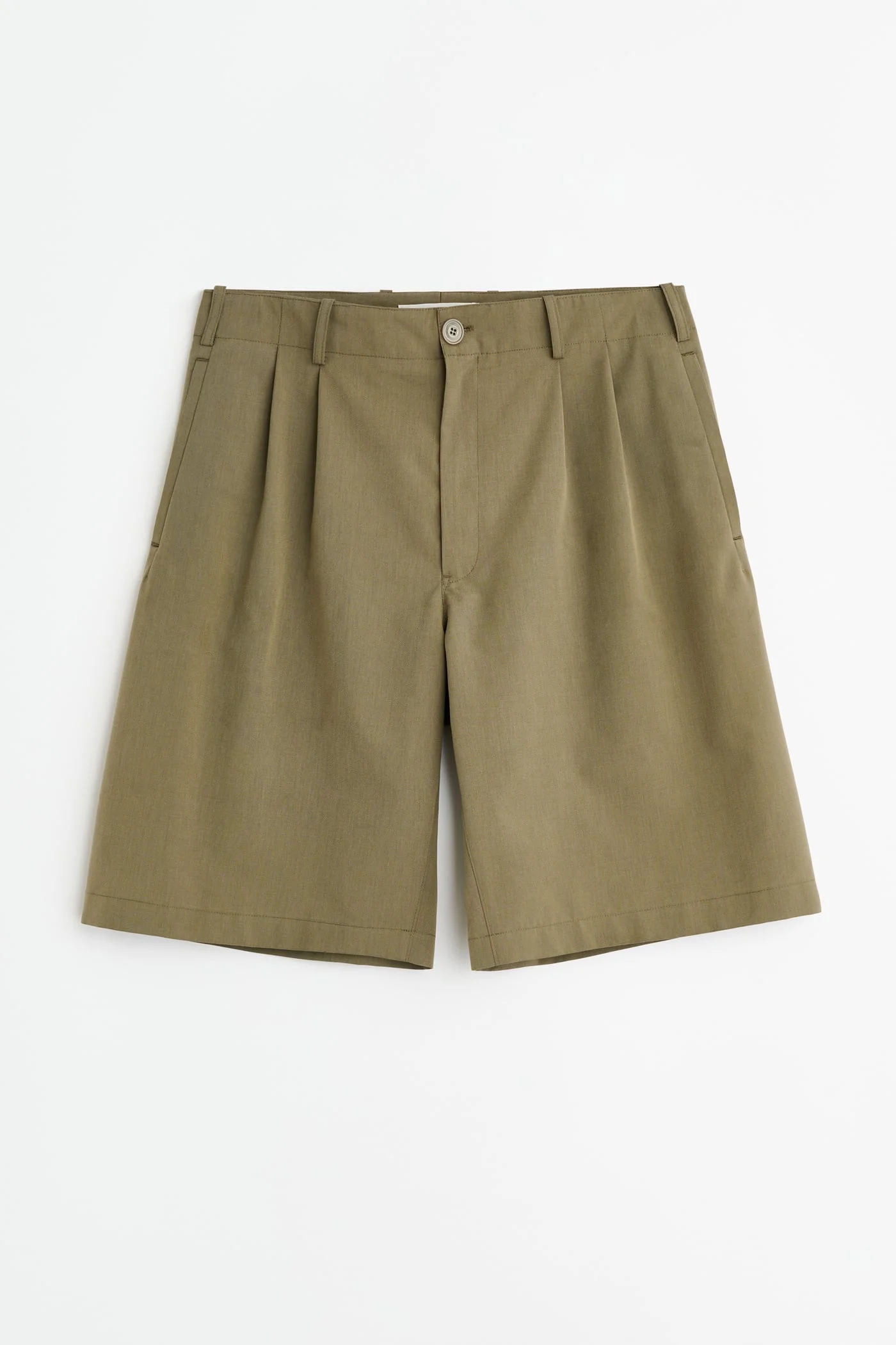 Details · Italian fabric · 58% Virgin Wool 42% Cotton · Double pleated · No side seam · YKK zip fly · Front welt pockets · Corozo buttons · Darted for shape · Welt back pockets · Relaxed fit · W2264PDL Description Our Ponte Shorts in Dry Leaf Balance Woolcot. Produced in an Italian virgin wool and cotton blend fabric, the Ponte Shorts have a relaxed fit and feature double pleats, a darted construction for shape, and a clean silhouette with no side seam. Details include a YKK zip fly, front welt pockets, welt back pockets and corozo buttons.