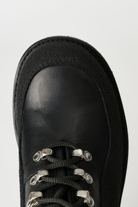 Details · Italian leather · Kevlar rand · Metal eyelets and speed hooks · Vibram lugged sole · Padded cuff · Mid-height shaft · Hiking boot inspiration · A4257QB Description Our Quest Boot in Black Tensile Cattle Hide. Produced in Italian leather, the Quest Boot draws inspiration from traditional hiking boots and features a mid-height shaft with an angled and padded opening that sits comfortably around the ankle. The boot includes Kevlar reinforcement around the full base of the foot, metal eyelets and speed hooks, a Vibram lugged sole, and padded cuff construction. This product is crafted from carefully sourced leather. As a natural material, leather carries subtle traces of the animal's life. These natural imperfections bring a unique character to each product, expressing an original and authentic look. The product shall be shaped by its wearer and naturally distress over time to complete the design process.