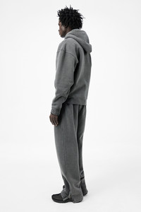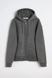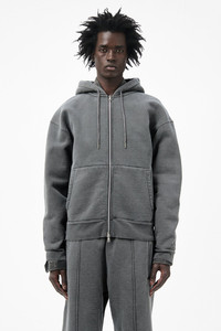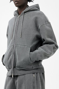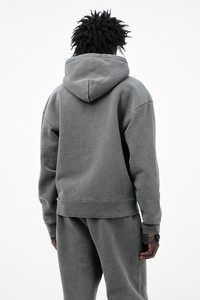 Details · Portuguese heavyweight jersey · 100% Organic Cotton · Piece dyed · Washed finish · Drawstring hood · Lampo two way zip · Kangaroo pocket · Ribbed cuffs and hem · Dropped shoulders · Boxy, cropped fit · M4256RW Description Our Rascal Hood in Worn Black Hefty Fleece. Produced in Portuguese heavyweight jersey made from organic cotton, the Rascal Hood has a boxy, cropped fit with dropped shoulders and features a piece-dyed washed finish, drawstring hood, Lampo two-way zip, kangaroo pocket, and ribbed cuffs and hem. This garment is manufactured using carefully sourced material with a unique treatment process that will give each garment an individual shade and appearance. This technique could result in some color bleed onto lighter garments or surfaces. The garment shall be shaped by its wearer and naturally distress over time to finish the design process.