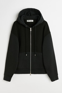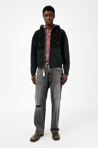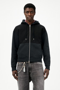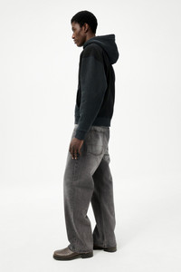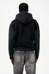 Details · Portuguese heavyweight jersey · 100% Organic Cotton · Piece dyed · Drawstring hood · Lampo two way zip · Kangaroo pocket · Ribbed cuffs and hem · Dropped shoulders · Boxy, cropped fit · M2256RP Description Our Rascal Hood in Pigment Black Hefty Fleece. Produced in a piece dyed heavy weight Portuguese organic cotton jersey, the mens Rascal Hood has a boxy, cropped fit and features a drawstring hood, a two way lampo zip, a kangaroo front pocket and ribbed cuffs and hem. This garment is manufactured using carefully sourced material with a unique treatment process that will give each garment an individual shade and appearance. This technique could result in some color bleed onto lighter garments or surfaces. The garment shall be shaped by its wearer and naturally distress over time to finish the design process.