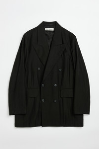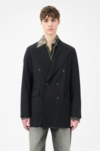 Details · Chinese fabric · 93% Viscose 7% Polyester · Crinkled effect · Sharp peak lapel · Double breasted · Half canvas construction · Horn buttons · Vented back · Two patch pockets · Relaxed fit · M4220SBF Description Our Sharp DB Blazer in Black Experienced Viscose. Produced in a viscose and polyester blend crinkled fabric, the mens double breasted Sharp DB Blazer has a relaxed, tailored fit and features a sharp peak lapel, horn buttons, a vented back and two flap pockets. This garment is manufactured using a crinkled fabric, carefully sourced for its particular characteristics. Due the polyester yarn properties, the crinkled effect is made possible through a heat treatment on the finished weave. Through the cleaning process, the crinkled effect will naturally fade over time.