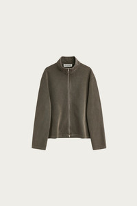 Our Shrunken Fullzip in Worn Graphite Athletic Rib. Produced in a Portuguese organic cotton athletic rib and piece dyed for a lived-in tone, the Shrunken Fullzip has a short, boxy fit and features a Lampo two way zip, a funnel neck collar, flatlock seams and a straight hem. This garment is manufactured using carefully sourced material with a unique treatment process that will give each garment an individual shade and appearance. This technique could result in some color bleed onto lighter garments or surfaces. The garment shall be shaped by its wearer and naturally distress over time to finish the design process.