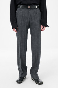 Details · Italian fabric · 88% Virgin Wool 12% Polyamide · Plisse treatment · Low rise · Hidden closure · Pre-constructed waistband · Slight bootcut · Two side pockets · Two back pockets · Fully lined · Corozo buttons · YKK Zip fly · M4254SSG Description Our Slack Trouser in Stone Grey Plisse Wool. Produced in Italian fabric with virgin wool and polyamide composition, the men's Slack Trouser has a relaxed fit with a low rise and features a hidden closure, pre-constructed waistband, slight bootcut, two side pockets, two back pockets, corozo buttons and YKK zip fly. This garment is crafted from a carefully selected fabric featuring a plisse treatment, chosen for its unique texture and character. This specialized technique creates a permanent crinkled and pleated effect, giving the material a distinctive three-dimensional quality and dynamic visual appeal.
