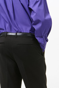 Details · Italian suiting fabric · 100% Virgin wool · Hidden closure · Pre-constructed waistband · Two side pockets · Two back pockets · Horn buttons · YKK Zip fly · Low rise · Slight bootcut · M2264SB Description Our Slack Trouser in Black Worsted Wool. Produced in Italian suiting fabric in virgin wool, the men's Slack Trouser has a low rise fit with a slight bootcut and features a hidden closure, pre-constructed waistband, YKK zip fly, horn buttons, two side pockets and two back pockets.
