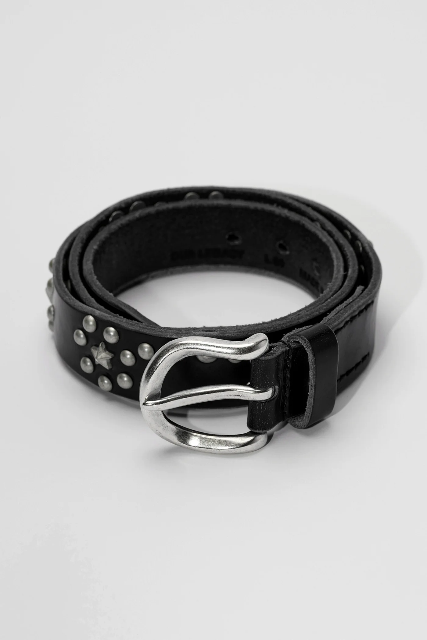 Details · British bridle leather · Star Fall stud pattern · Metal pin buckle closure · Single keeper · Hand cut · 35mm wide · Dust bag · A4228SB Description Our Star Fall Belt in Black Bridle. Hand cut in Portugal from a British leather hide, the belt is 3,5 cm wide and features a studded Star Fall design, a metal pin buckle closure, a leather keeper and a ripstop dust bag. The belt has a width of 3,5 cm and measures 70 cm, 80 cm, 90 cm or 100 cm from the end to the middle belt hole - including the buckle. This product is crafted from carefully sourced leather. As a natural material, leather carries subtle traces of the animal's life. These natural imperfections bring a unique character to each product, expressing an original and authentic look. The product shall be shaped by its wearer and naturally distress over time to complete the design process.