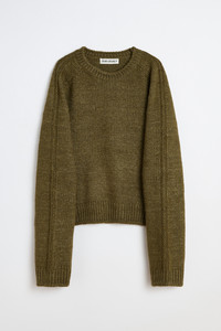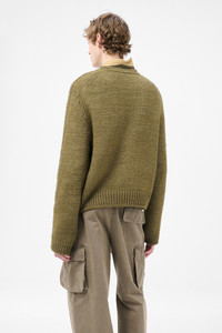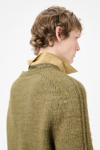 Details · Italian yarn · 50% Wool 50% Silk · Plain knit · Saddle sleeves · Drop stitch sleeve details · Ribbed collar, cuffs and hem · Regular, straight fit · M4253TF Description Our True Roundneck in Flush Green Rustic Wool Silk. Produced in Italian wool silk yarn, the men's True Roundneck has a regular, straight fit and features plain knit construction, saddle sleeves with drop stitch details, and ribbed collar, cuffs and hem. This garment is manufactured using a carefully sourced yarn. The natural characteristics of the yarn, combined with the construction of the knit allows the garment to expand when worn. The garment shall be shaped by its wearer and naturally distress over time to finish the design process.