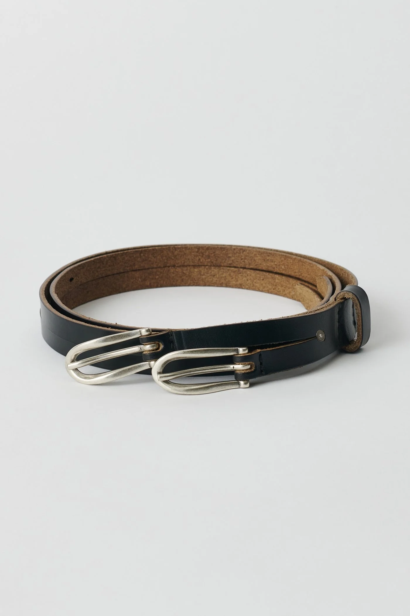 Details · American chromexcel leather · Split asymmetrical construction · Two metal pin buckles · Leather keeper · 40mm wide · Dust bag · A2258TBC Description Our Twin Tongue Belt in Black Chromexcel Leather. Produced in an American Chromexcel cow leather with a split asymmetrical belt construction, the belt is 4 cm wide and features two buckles with single pin closure, a leather keeper, a centred slit and a dust bag cover. The belt has a width of 4 cm and measures 80 cm, 90 cm or 100 cm from the buckle to the third to last hole on the shorter split section. This product is crafted from carefully sourced leather. As a natural material, leather carries subtle traces of the animal's life. These natural imperfections bring a unique character to each product, expressing an original and authentic look. The product shall be shaped by its wearer and naturally distress over time to complete the design process.