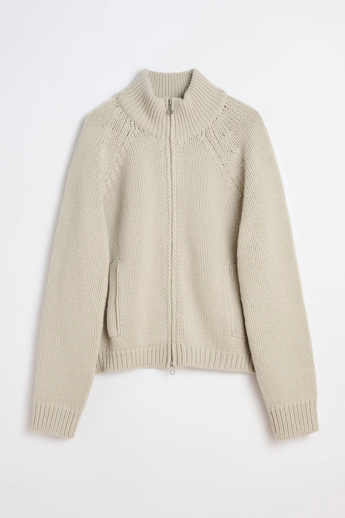 Details · Italian yarn · 100% Extrafine Merino Wool · Heavy weight knit · Ribbed funnel neck collar · Two way zip · Raglan shoulders · Elongated sleeves · Two welt pockets · Cropped boxy fit · M4253UB Description Our Ultra Zip Cardigan in Bone Low Twist Merino. Produced in Italian extrafine merino wool yarn, the men's Ultra Zip Cardigan has a cropped boxy fit and features a ribbed funnel neck collar, two-way zip, raglan shoulders with elongated sleeves, and two welt pockets. The heavy weight knit construction provides warmth and structure while maintaining the signature relaxed silhouette. This garment is manufactured using a carefully sourced yarn. The natural characteristics of the yarn, combined with the construction of the knit allows the garment to expand when worn. The garment shall be shaped by its wearer and naturally distress over time to finish the design process. To help keep the integrity of the garment please store folded.