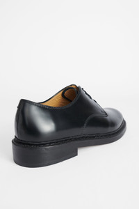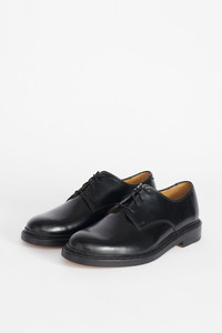 Details · Italian leather · Norwegian welted · Leather outsole · Stacked heel · Leather lined · Derby style · M1937UPBL Description Our Uniform Parade Shoe in Black Leather. Produced in an Italian leather this classic derby shoe features a Norwegian welted leather outsole, four eyelets and a stacked heel. The Uniform Parade Shoes fit a little large and we would suggest sizing down if you are between sizes. Please note that sizing is mens EU. We recommend going down one size for womens EU equivalent.