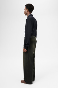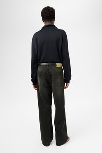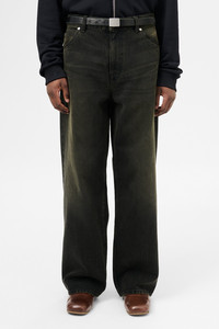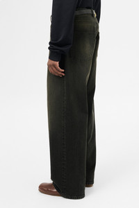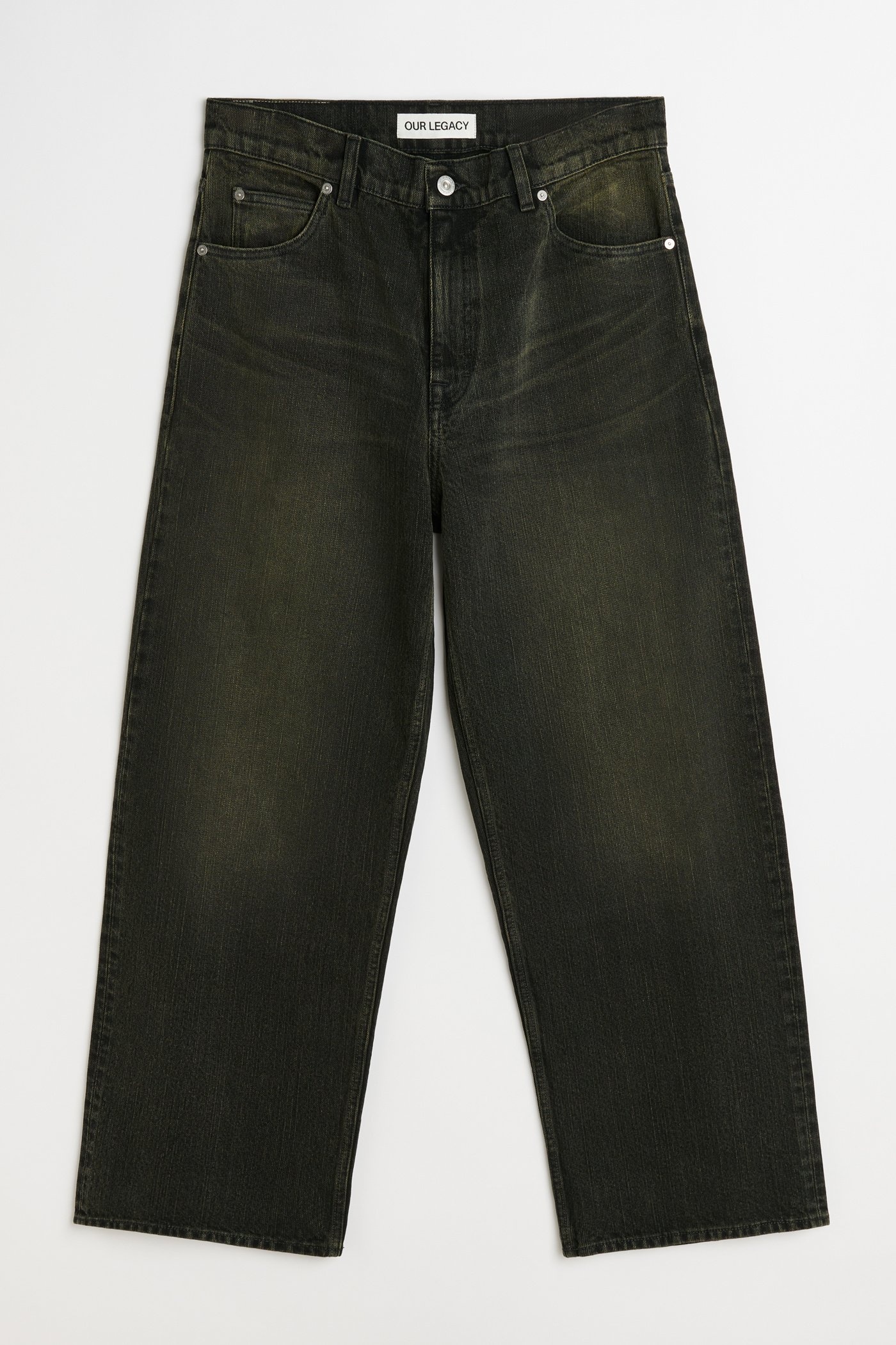 Details · Italian chain twill denim · 100% Cotton · Pigment dyed · Vintage sand wash · Wide loose cut · High waist · Five pockets · Steel rivets · Embossed Our Legacy rubber patch · YKK zip fly · M2255VBS Description Our Vast Cut in Black Sand Chain Twill. Produced in a pigment dyed Italian chain twill denim with a vintage sand wash, the mens Vast Cut jeans have a loose, wide cut straight fit and feature a YKK zip fly and an embossed Our Legacy rubber patch. This garment is manufactured using carefully sourced material with a unique treatment process that will give each garment an individual shade and appearance. This technique could result in some color bleed onto lighter garments or surfaces. The garment shall be shaped by its wearer and naturally distress over time to finish the design process.