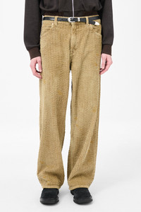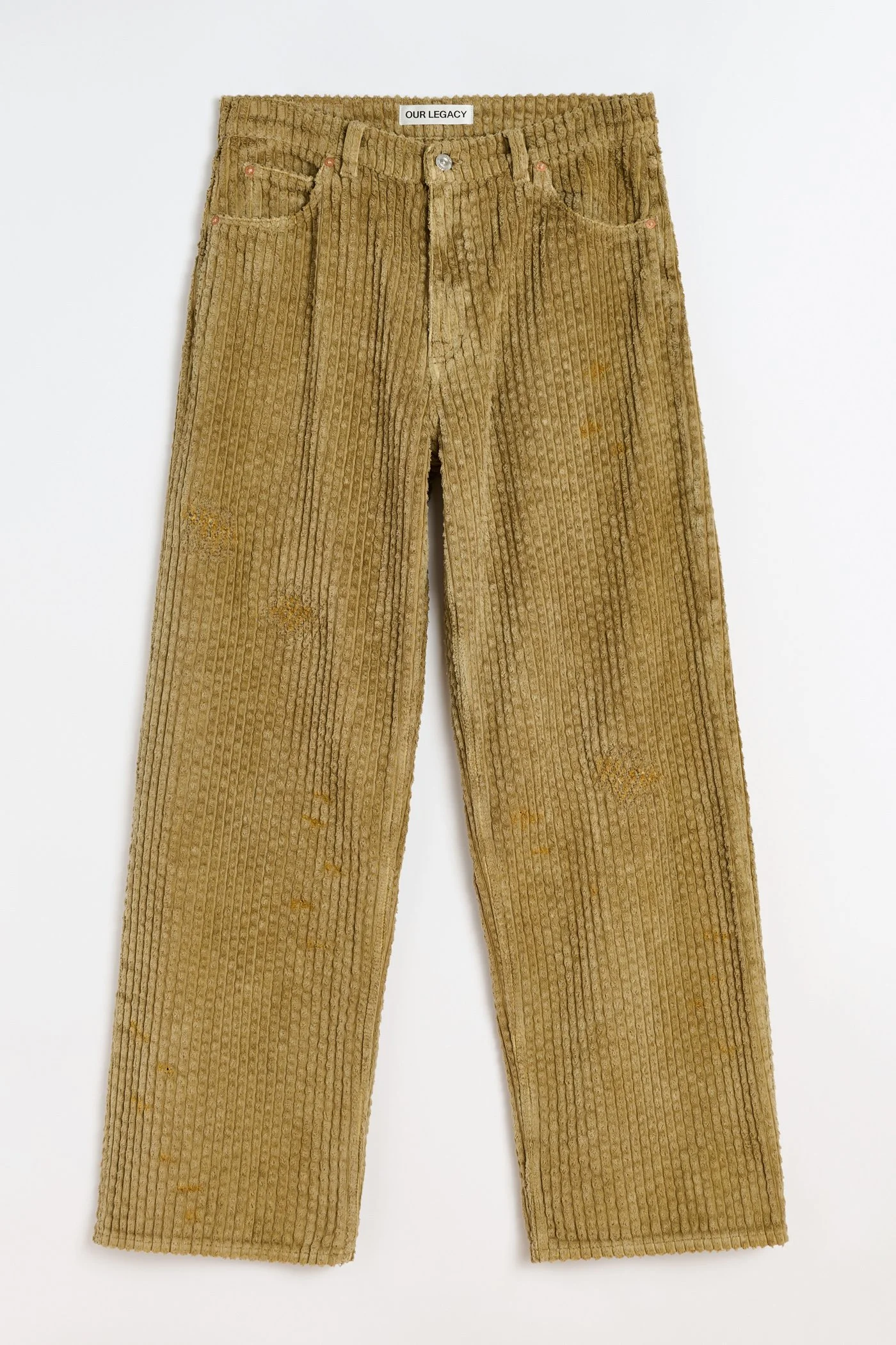 Details · Italian fabric · 100% Cotton · Pigment dyed corduroy · Distressed by hand · Each pair has a unique fade and staining · Wide loose cut · High waist · Five pockets · Steel rivets · Embossed OUR LEGACY patch · YKK zip fly · M4255VT Description Our Vast Cut in Tired Teddy Wash. Produced in Italian cotton corduroy, the men's Vast Cut has a high waisted, loose oversized fit with wide straight legs and features pigment dyeing, hand-distressed detailing and staining, a YKK zip fly, steel rivets, five pockets, and an embossed OUR LEGACY patch. This garment is manufactured using carefully sourced material with a unique treatment process that will give each garment an individual shade and appearance. This technique could result in some color bleed onto lighter garments or surfaces. The garment shall be shaped by its wearer and naturally distress over time to finish the design process.