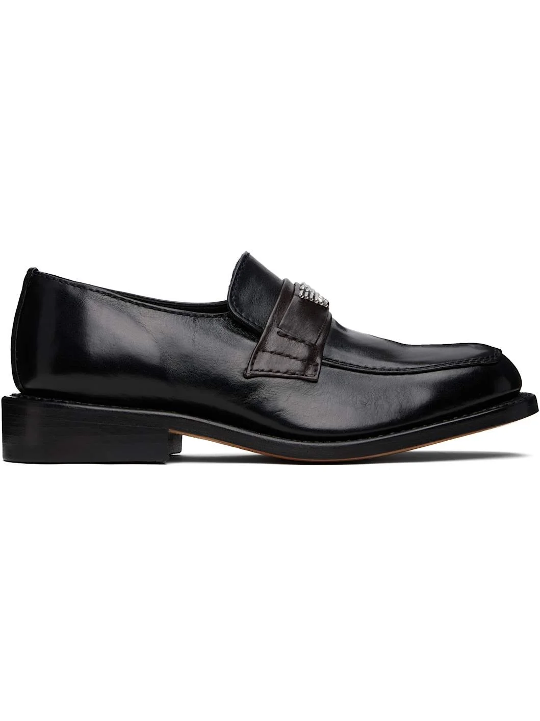 Buffed leather loafers in black. · Square moc toe · Strap with logo hardware at vamp · Topstitching at welt · Stacked leather heel with rubber injection · Leather sole Part of the OUR LEGACY WORK SHOP, in collaboration with Emporio Armani. Supplier color: Tinta superiore leather Upper: leather. Sole: leather, rubber. Made in Portugal 252803M231005