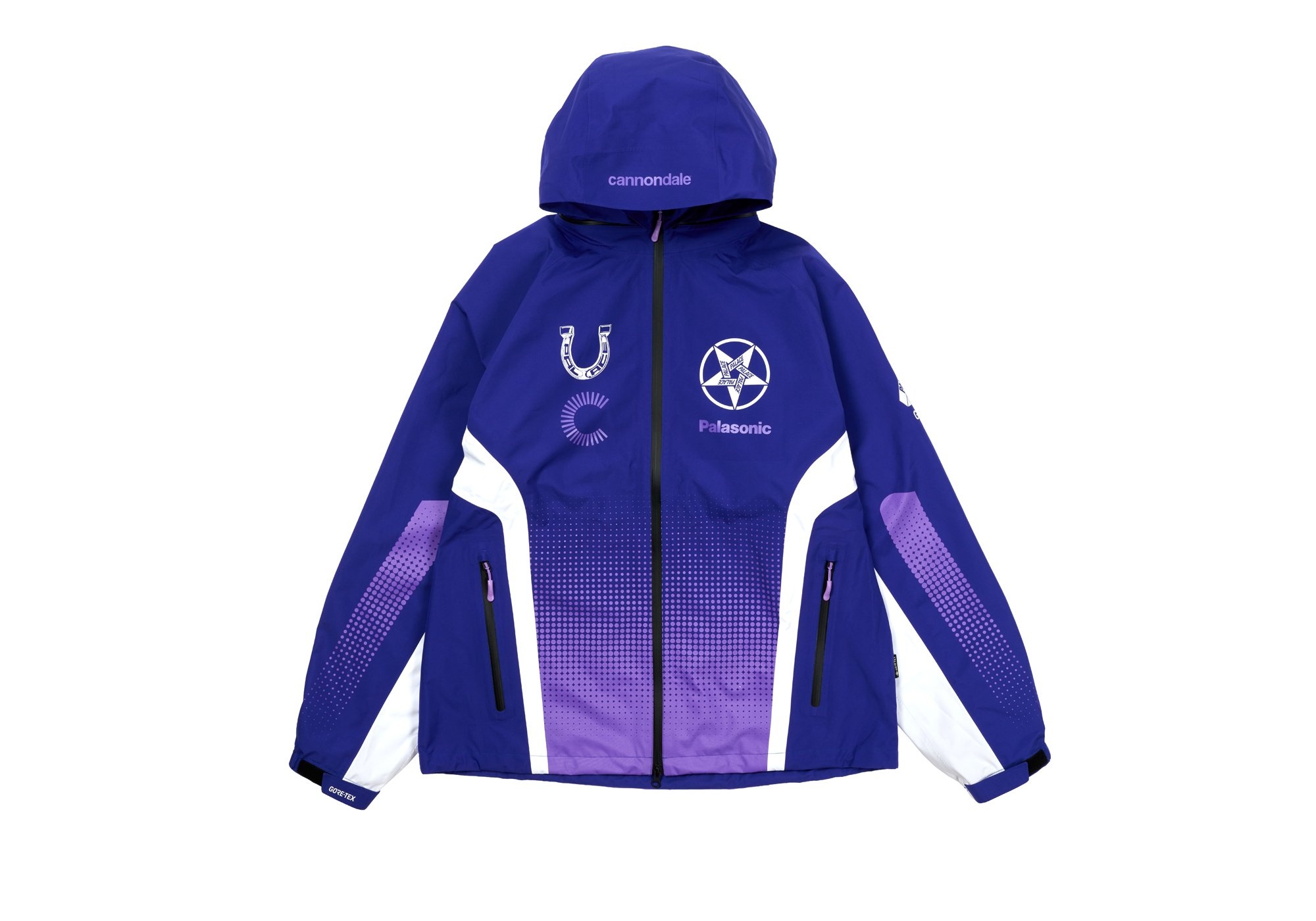 - I LIKE CANNONDALE - LETTING US MAKE - A MENTAL BIKE - RESPECT - MOST COMPANIES - WE WORK WITH - AREN’T UP FOR PENTAGRAMS - AND PALASONIC LOGOS - ALL OVER THE PLACE Technical Details PALACE CANNONDALE MAD BOY GORE-TEX PACLITE JACKET BLUE / VIOLET Details - Gore-Tex Paclite fabric - Taped seam construction - Waterproof - YKK AquaGuard zipper - Zip out hood from collar - Split panel colour blocking - Cannondale branding - Gore-Tex branding - Palace Tri-Ferg sleeve branding - Mad Boy back panel graphic - Palace branded zip pulls