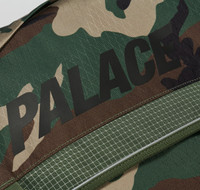 - i can’t find my bag as it is - so i don’t need a camo one TECHNICAL DETAILS - outer shell: 100% polyester eco re-cor cordura® diamond weave - outer trim: extrema x-grid ripstop (nylon + uhmwpe) - inner lining: polyester 150d - palace printed logo - large main compartment with 20mm closing clip - foam padded main base - four zipper compartments / pockets - foam padded inner back laptop slip pocket - YKK® nylon zippers - ergonomic zip pulls - poly webbing adjustable shoulder strap - poly webbing cross body support strap - hypalon trim - foam padded ergonomic + performance air mesh shoulder pad - woojin nylon dtm fittings - webbing carry handle - refective piping - palace branded detachable inner key clip / strap - palace branded side release clips