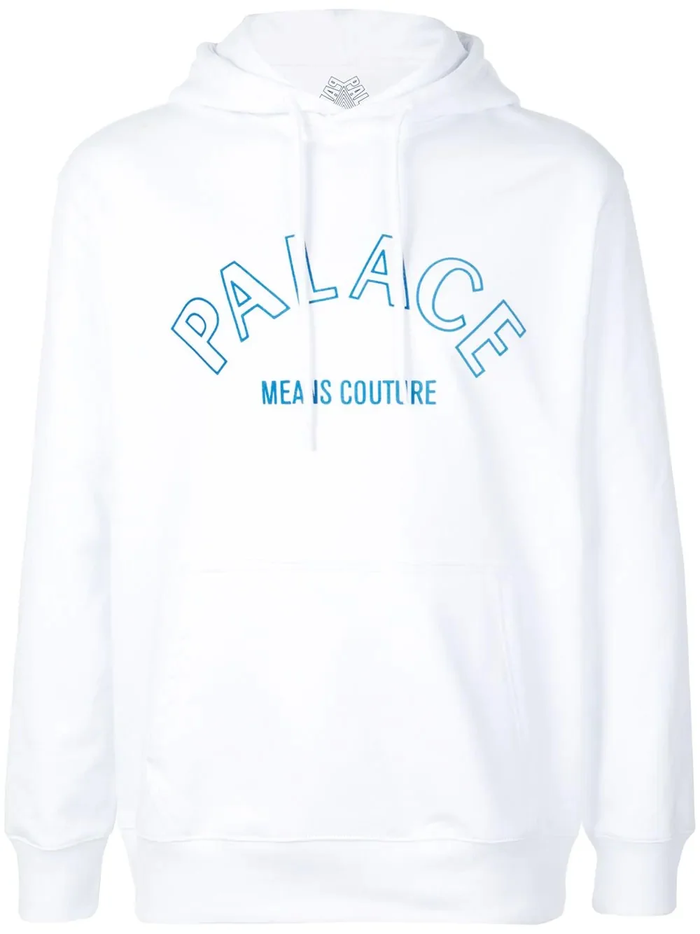 Couture logo-print hoodie The Palace Couture Hoodie sweatshirt is a versatile layering piece whether you’re skating, working, or walking around. Made with 100% cotton, the comfortable white hoodie comes with long sleeves, elasticated cuffs, a drawstring hood, and a kangaroo pocket. A “Palace Means Couture” graphic covers the chest with hollowed out and block letters. Over the years, Palace skatewear has become the streetwear of choice thanks to the brand’s nonchalant attitude, cool tees, and hoodies. Imported Composition Cotton 100% SIZE & FIT Model measurements Height 6 ft 2 in(1.88 m) Bust/Chest 38.18 in(97 cm) Hips 37 in(94 cm) Waist 29.92 in(76 cm) Washing instructions Machine Wash