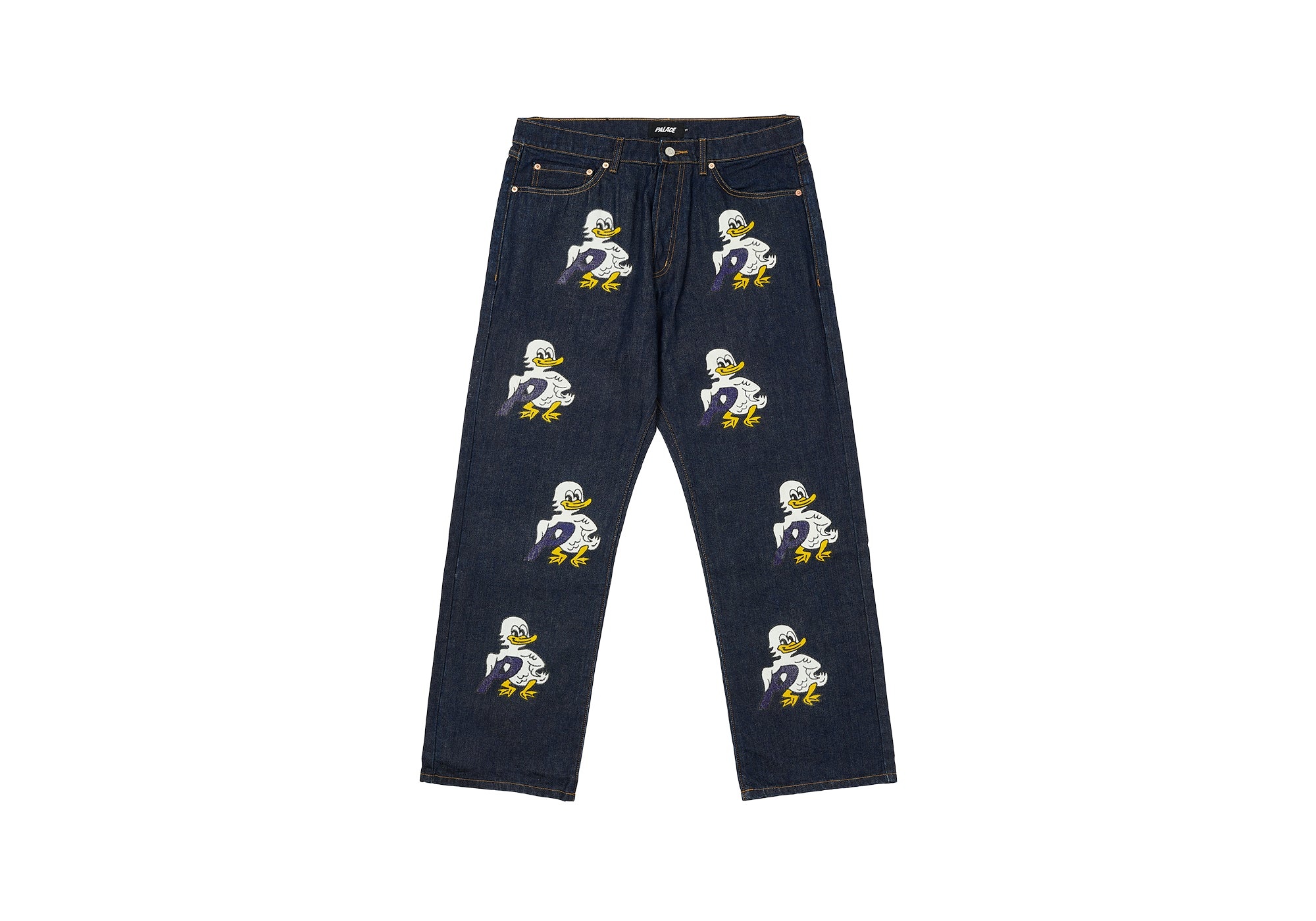 - DON'T GET STONED - AND WASH - IT TAKES AGES Technical Details DUCKS BAGGIES JEAN STONE WASH Details - Baggie jeans - Printed duck artwork on front and back - Two front and back pockets - Coin pocket - Palace branded buttons - Palace London leather patch - 100% cotton