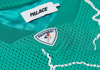 - WHY GO GYM - WHEN I CAN ORDER PIZZA - TO MY SOFA Technical Details HESH ATHLETIC JERSEY TURQUOISE Details - Mesh jersey with contrast panelling and piping - Palace branded logo applique and embroidery - Felt equipment badge on collar - Sports label on hem