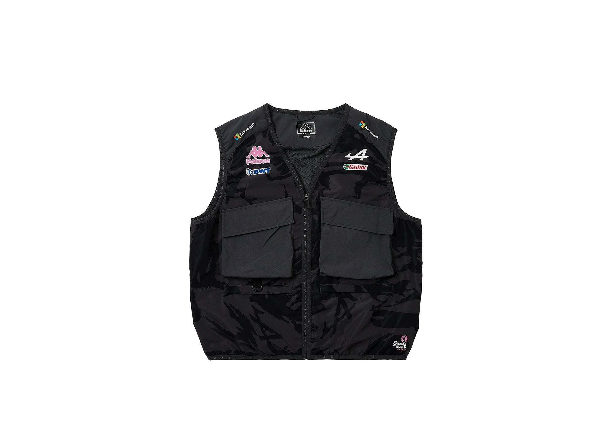 - I WONDER - IF YOU PUT - A PINE AIR FRESHENER - IN AN F1 CAR - AND WENT 200MPH - WOULD YOU BE ABLE - TO SMELL IT Technical Details PALACE KAPPA FOR ALPINE PIT VEST BODYWARMER NIGHT DESERT CAMO Details - Kappa Gara - Zip through opening - 100% polyester taslan - Poly mesh panel lining - Digital print camo - Lycra bound hem and armhole - Bellowed pockets at chest - Low cut neck for layering - Two zip-closure hand pockets - Multi logo application branding