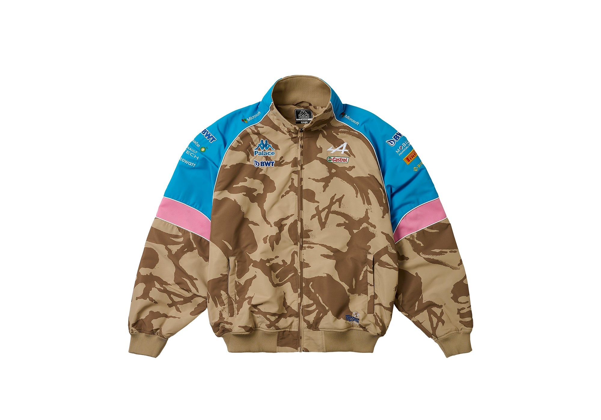 - PALACE SETS THE LEVELS - ALL OTHER CLOTHING COMPANIES - INVOLVED IN THIS RACE - CAN’T WRAP A ZOOT - LET ALONE AN F1 CAR Technical Details PALACE KAPPA FOR ALPINE TRACKSUIT TOP DESERT CAMO Details - Kappa Gara - Classic track top details - 100% polyester taslan - Poly mesh panel details - Digital print camo - Poly rib hem & cuff - Performance design lines - Multi logo application branding - Two zip-closure hand pockets - Palace track top fit