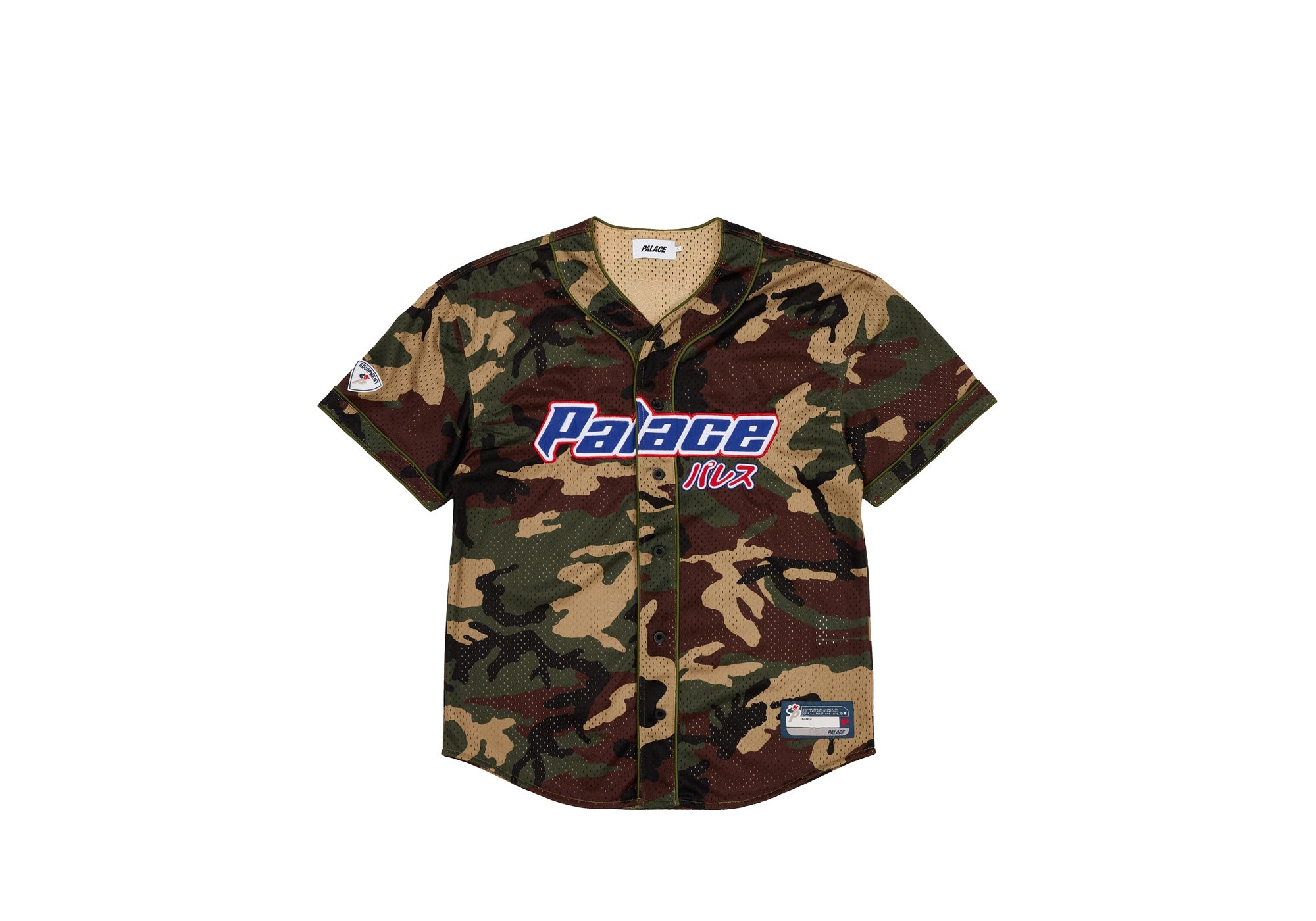 - CAMO - SPORTY - BITZ Technical Details KAWAII BASEBALL JERSEY CAMO Details - Poly mesh fabric - Satin chest applique - Palace branded buttons - Poly piping detail - Equipment felt label on arm - Woven label on hem