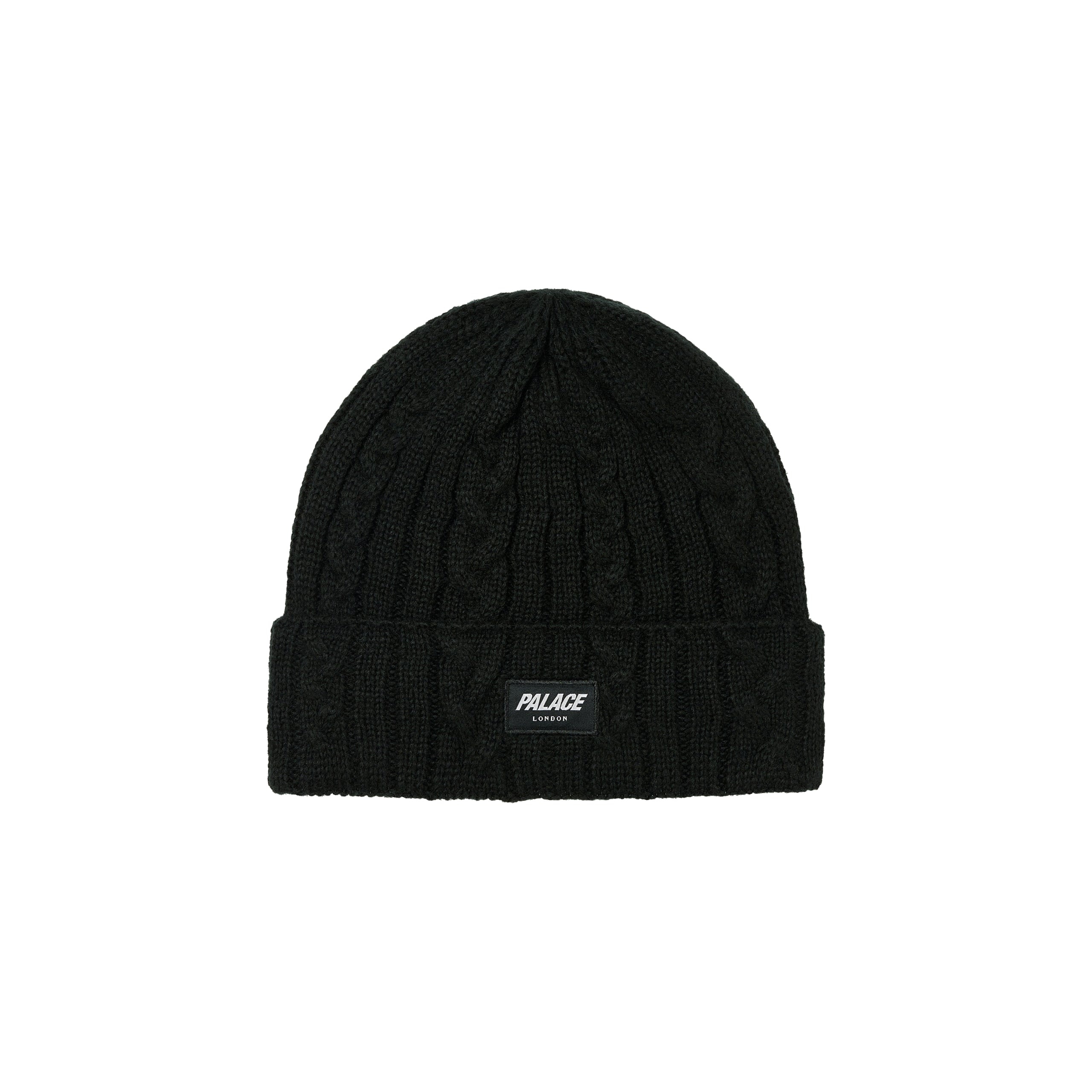 - palace - links - it TECHNICAL DETAILS - cashmere acrylic blend cable knit cuff beanie - front woven palace badge