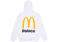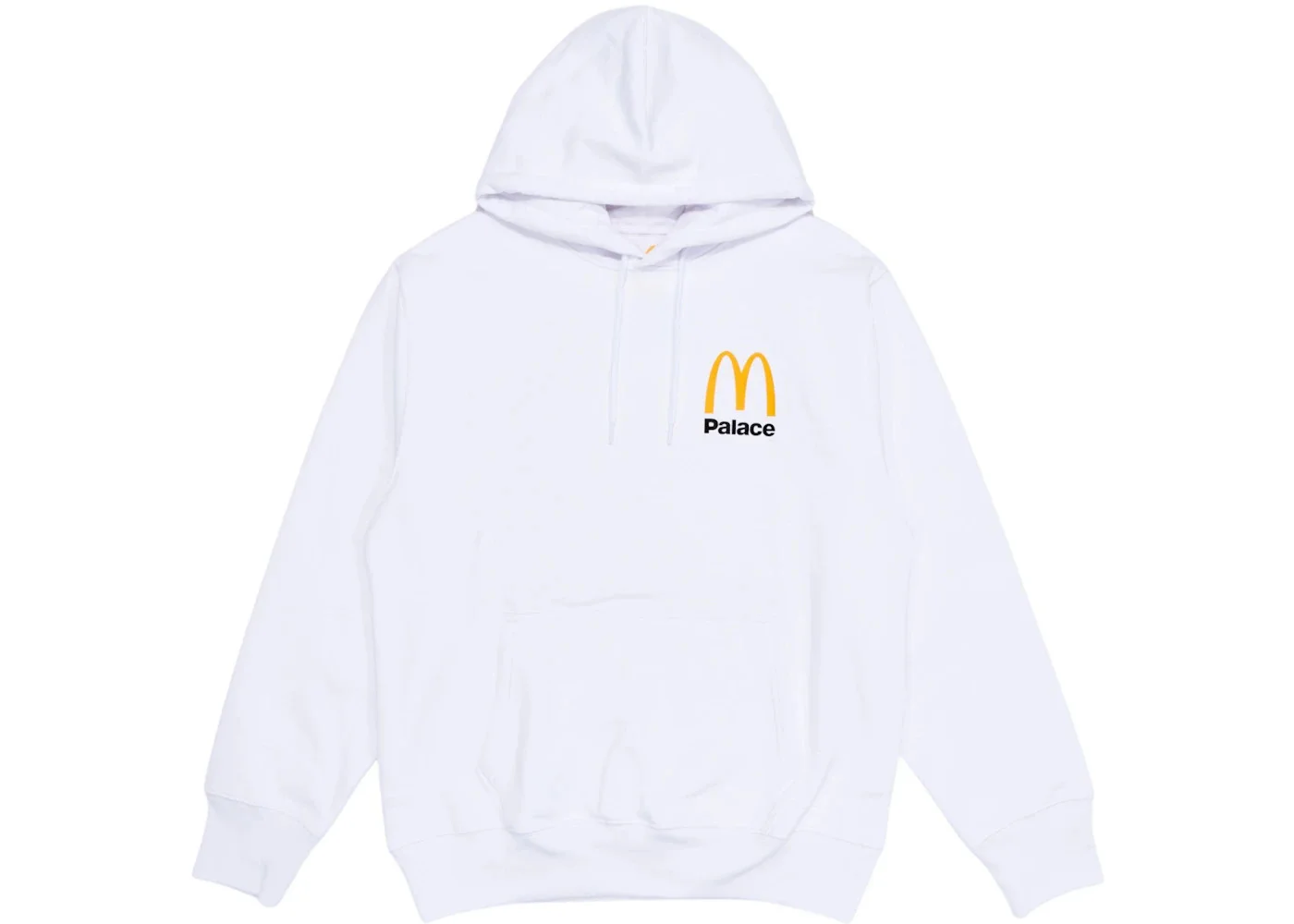 The Palace x McDonald's Logo Hood White is a white jersey-knit fleece pullover hoodie with a two-hand center front pocket. Hailing from London, England, Palace is a skateboarding and streetwear brand founded in 2009. Known for their collaborations, Palace worked with American fast-food brand McDonald’s on a collaborative collection of over fifteen styles. The initial release was only available for purchase after scanning a QR code included with the "As Featured in McDonald's" meal and was announced via a billboard in Times Square. The White Palace x McDonald's Logo Hood front displays a small McDonald’s golden arches logo above the Palace text branding, while the reverse repeats the double logo on a large scale. In our opinion, the best feature of the Palace McDonald’s Hood is the Palace logo, which uses the typical McDonald’s font, adding a twist to the imagery. The Palace x McDonald's Logo Hood White was released on August 14, 2023, and retailed at $148. - Season FW23 - Color White - Release Date 2023-08-14 - Retail Price 148 - Featured false - Uploaded By LL