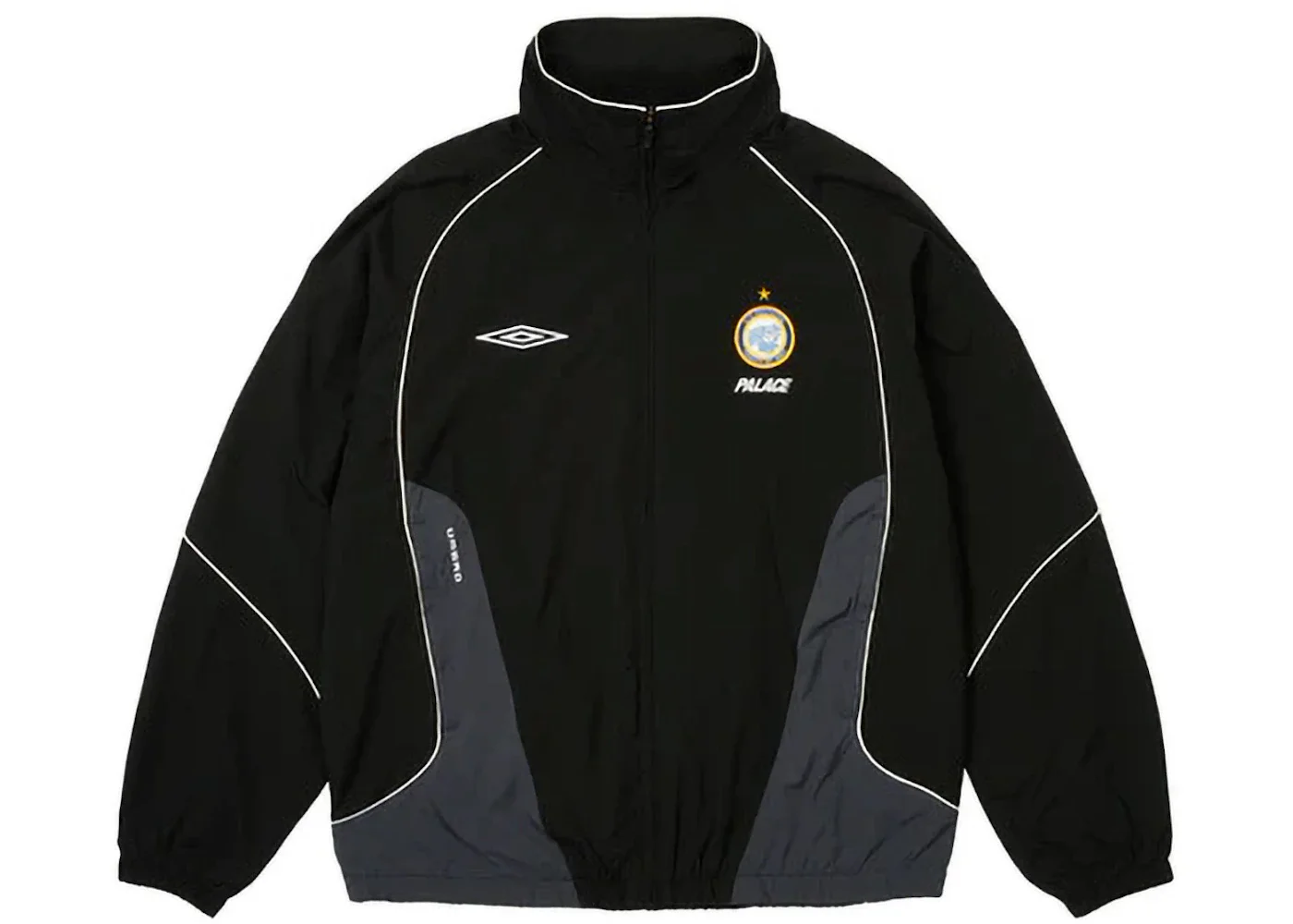 The Palace x Umbro Training Track Jacket Black is a zip-front warm-up jacket in black, accented by gray inserts on the body and white piping. Palace and Umbro crest badges appear on both sides of the chest, with additional Umbro branding below the diamond logo. The rear of the jacket features Palace branding, the Umbro logo, and Palio on the collar, all in white. Umbro, the English football and sportswear outfitter, is known for its century-plus history in sportswear. Skateboarding and streetwear brand Palace, based in London, has been England’s coveted skate gear supplier since its founding in 2009. The two brands collaborated in 2024 to create a collection highlighting the early 2000s football heyday, channeling the Premier League era. In our opinion, the best feature of the Training Jacket is its sporty, casual style, which works for both the match and the street. The Palace x Umbro Training Track Jacket Black was released on March 8, 2024, and retailed at $208. - Season SS24 - Color Black - Release Date 2024-03-08 - Retail Price 208 - Featured false - Requester Kelsey K - Uploaded By LL