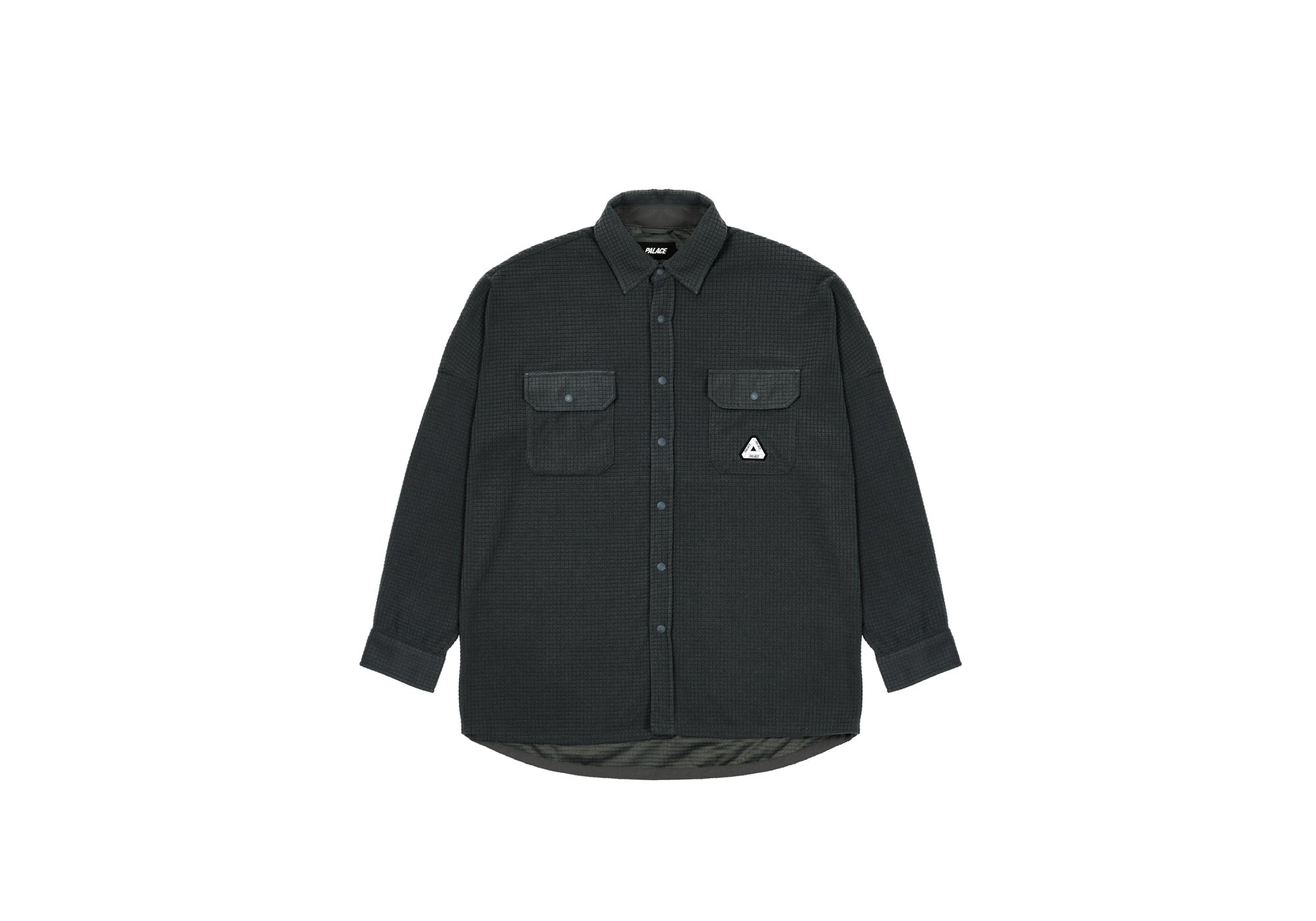 - WARM - MIT DAS - SEMI BASIC Technical Details POLAR GRID OVERSHIRT BLACK Details - Polar fleece grid fabric - Sungrip Japan snaps - Nylon taslan facings - Palace woven badge at front left pocket - Palace outline logo embroidery on back panel
