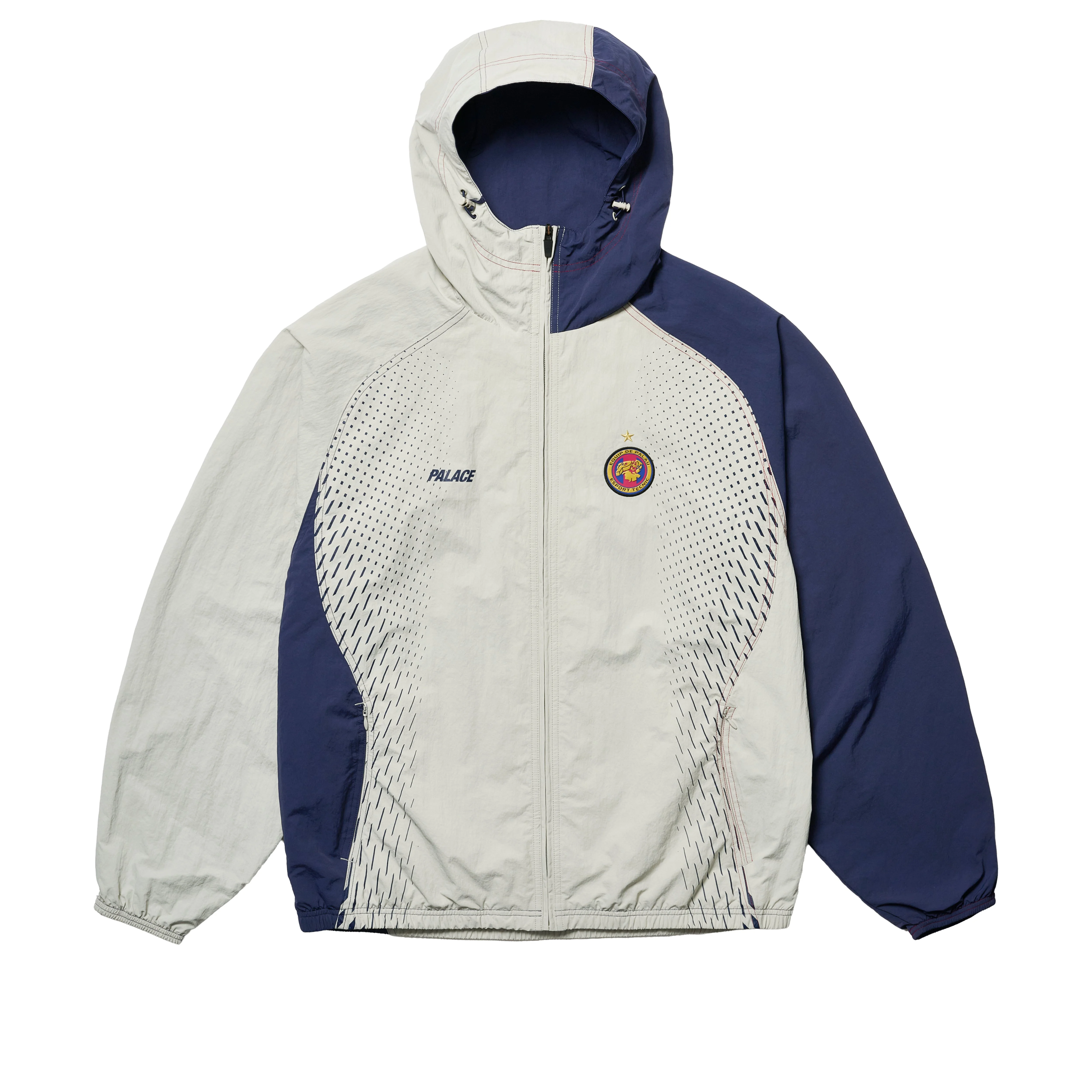 - 100% - monsieur - shower face - bits TECHNICAL DETAILS - Contrast coloured panels and top stitching - Geometric pattern on front and back body - Front badge with star embroidery - Screen printed Palace text - Concealed pockets with zips - Elasticated cuff and hem