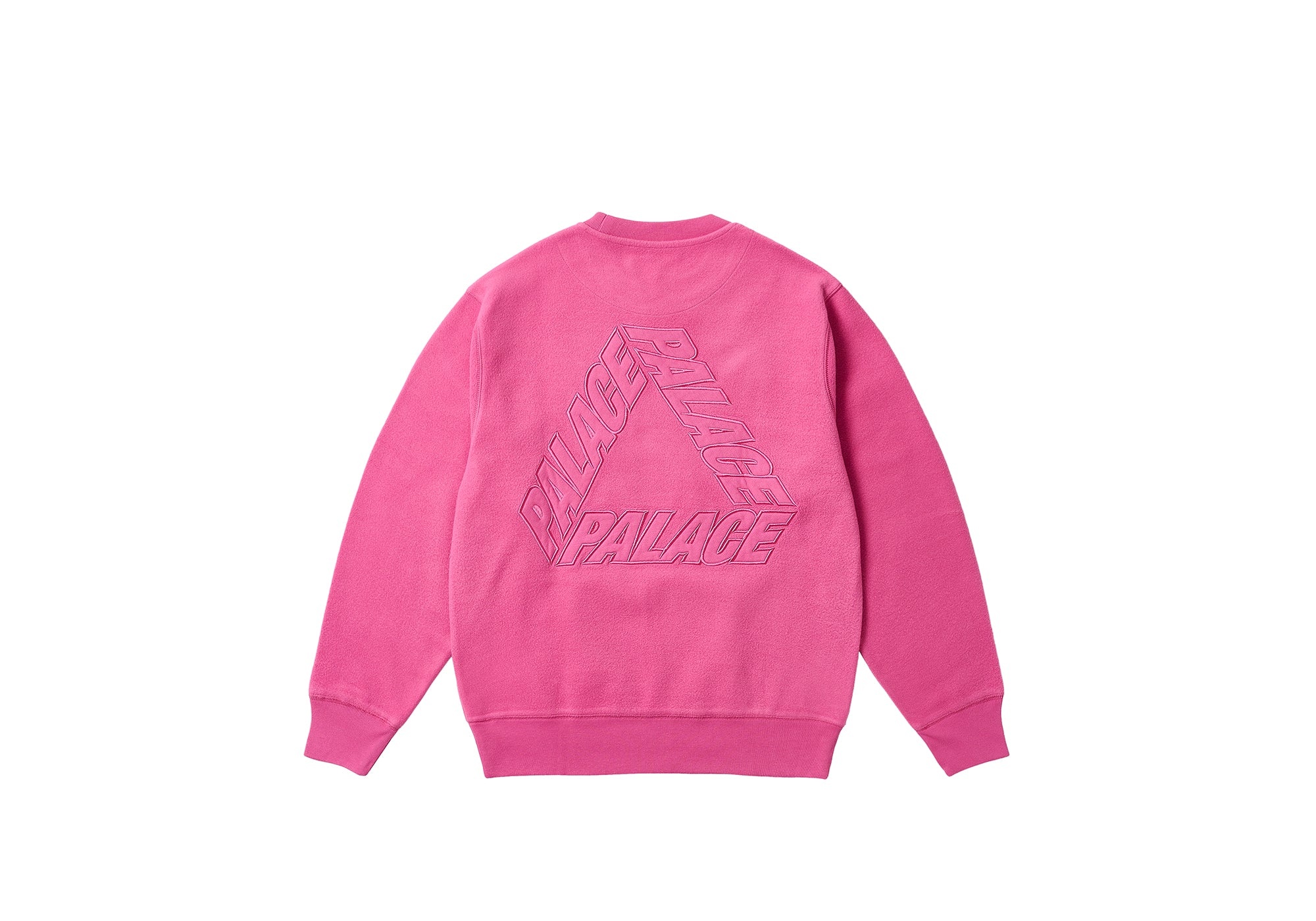 - 100% - CLASSIC - PALACE Technical Details REVERSE P-3 CREW SHOCK PINK Details - 400gsm reverse brush fleece crew - P sweat applique face fabric at chest - Palace P-3 sweat applique face fabric on the back - 100% cotton