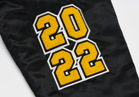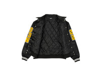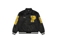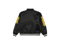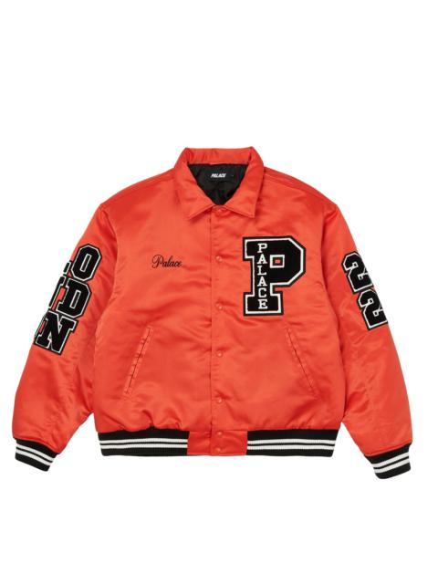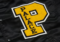 - LOOK AFTER THE PENNIES - AND THE POUNDS - WILL TAKE CARE - OF THEMSELVES - YOU WILL COME ACROSS QUITE TIGHT THOUGH Technical Details SATIN VARSITY JACKET BLACK Details - Satin bomber jacket - Palace branded YKK snaps - Chenille artwork patches on chest and sleeves - Quilted nylon lining with light fill - Embroidered Palace logo on chest - Palace Branded flag label at side seam - Two front pockets