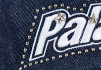 - YOUR DAD'S - COPPED - BARE STUDDED - LEATHER GARMS - AND MOVED - TO GERMANY Technical Details STUDDED DENIM TRUCKER INDIGO Details - Kaihara Japanese denim trucker cap with mesh back panels - Front embroidered & metal stud embelished Palace logo - Metal stud embelished visor - Adjustable plastic snap closure with Palace seam label