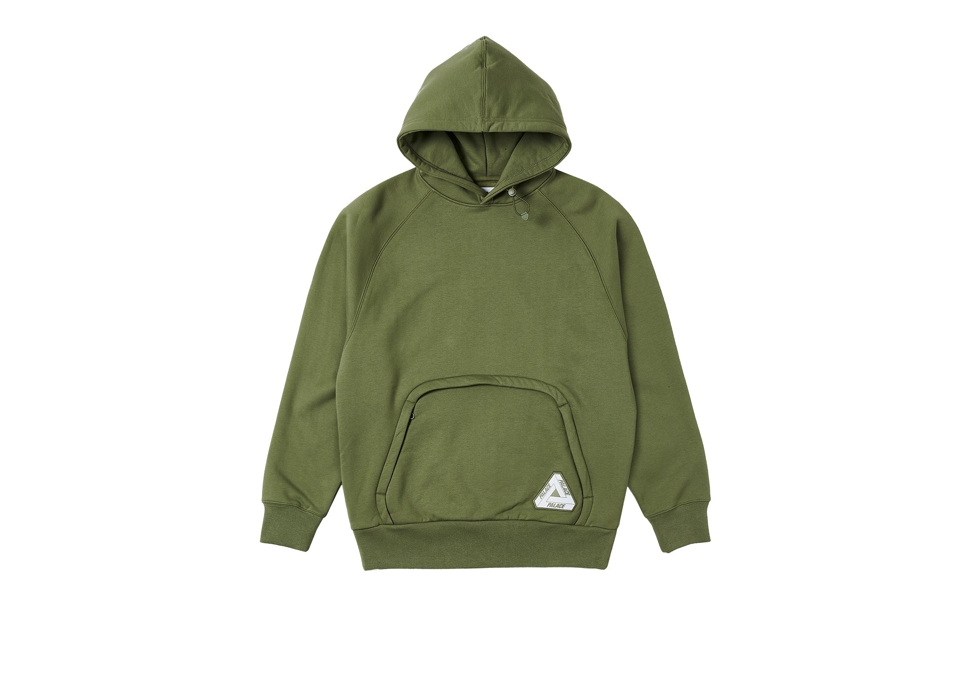 - 90% - DON’T - BE - MOIST Technical Details TRI POCKET HOOD THE DEEP GREEN Details - Large woven Tri-Ferg label on kangaroo pocket with zips - Drawcord hood with cord lock - Palace branded beads - 100% cotton