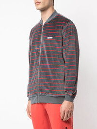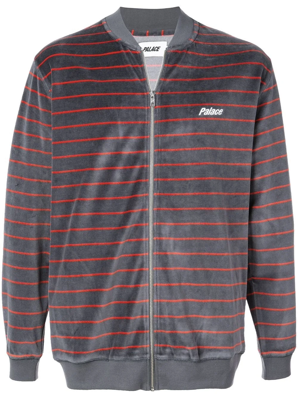 Velour striped bomber jacket The Palace Velour Bomber is a sweatshirt that resembles a bomber jacket. Perfect for day or night, the zip-up layering piece is grey with an orange horizontal striped pattern. The elasticated cuffs, collar, and hemline are solid grey. Boasting a velour feel, this Palace Velour Bomber is made up of 80% cotton and 20% polyester. Fashion history tip: Velour was originally made popular in the late 1970s and many remember a resurgence when Tony Soprano wore a velour tracksuit religiously on The Sopranos. Imported Composition Cotton 80%, Polyester 20% SIZE & FIT Model measurements Height 6 ft 1 in(1.85 m) Bust/Chest 39.76 in(101 cm) Hips 36.61 in(93 cm) Waist 27.95 in(71 cm) Washing instructions Machine Wash