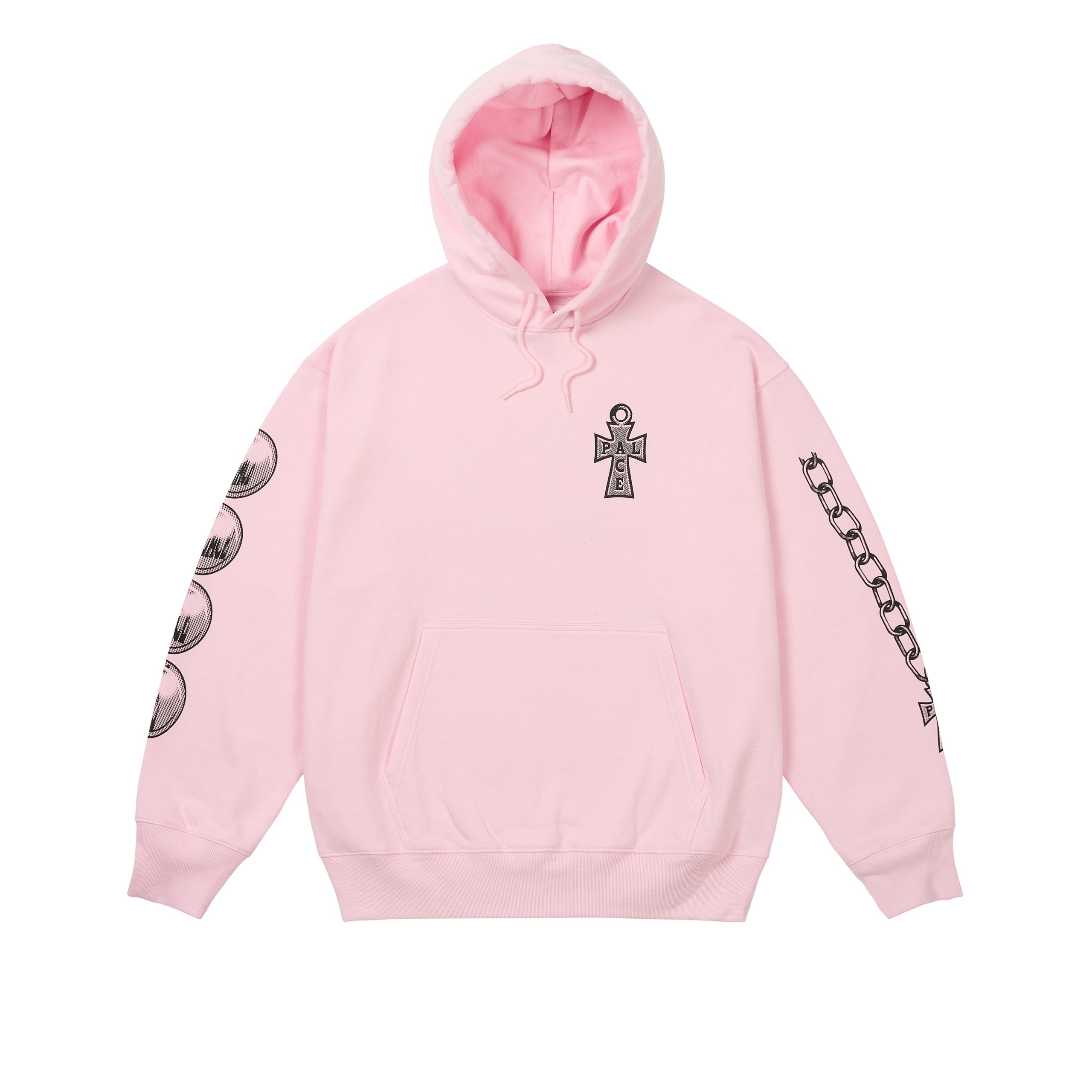 - crystals > pistols TECHNICAL DETAILS - 400GSM Brushback sweat fabric - Sleeve, front and back rubber print - Hood drawcords with palace branded aglets - Ribbed cuff and hem - 74% Cotton, 26% Polyester