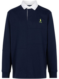 x Polo Ralph Lauren Pieced rugby shirt Palace and Polo Ralph Lauren’s Pieced rugby shirt in French Navy is among the most sought-after pieces from the highly publicized collaboration between the English skateboard brand and all-American label. It’s spliced from panels of heavyweight cotton with a dual logo at the chest. Highlights - Navy blue - Cotton - Jersey texture - Contrasting polo collar - Long sleeves - Ribbed cuffs - Embroidered logo at the chest - Concealed front button fastening Imported Composition Cotton 100% Washing instructions Dry Clean Only